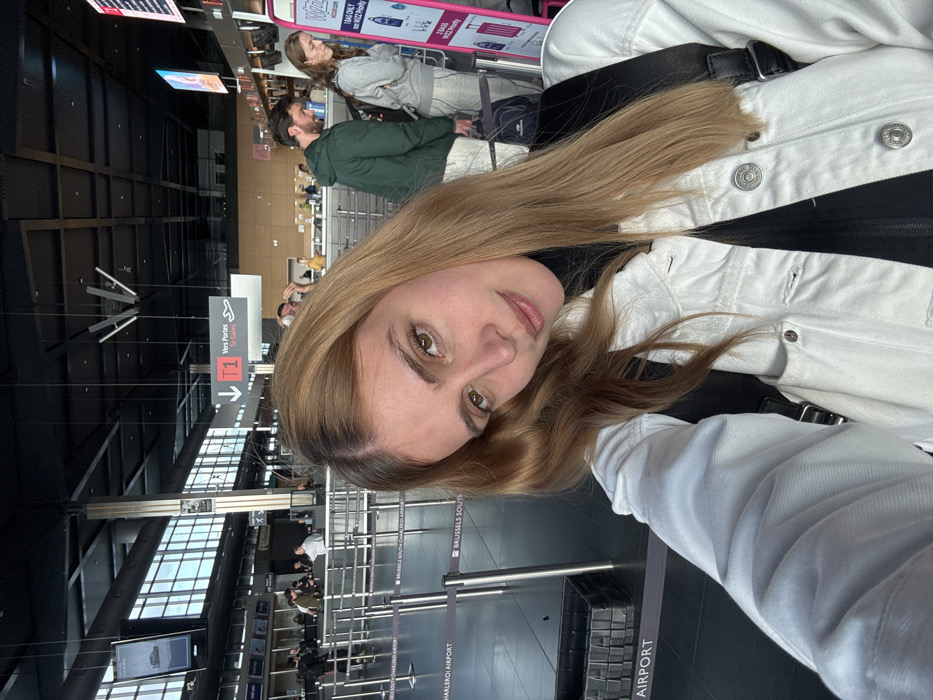 A young adult female with light brown hair and a white denim jacket takes a selfie inside the Brussels South Charleroi Airport (CRL) in Charleroi, Belgium