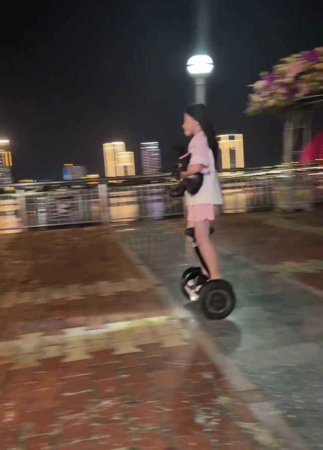 young person riding a two-wheeled electric scooter on a brick-paved area at night. The person is wearing a light-colored shirt and shorts, with dark hair. In the background are buildings and a bridge illuminated with colored lights. There are also lampposts and decorative flower arrangements nearby. The ground appears wet, possibly from rain. The camera follows the person as they ride, showing the surrounding urban environment.