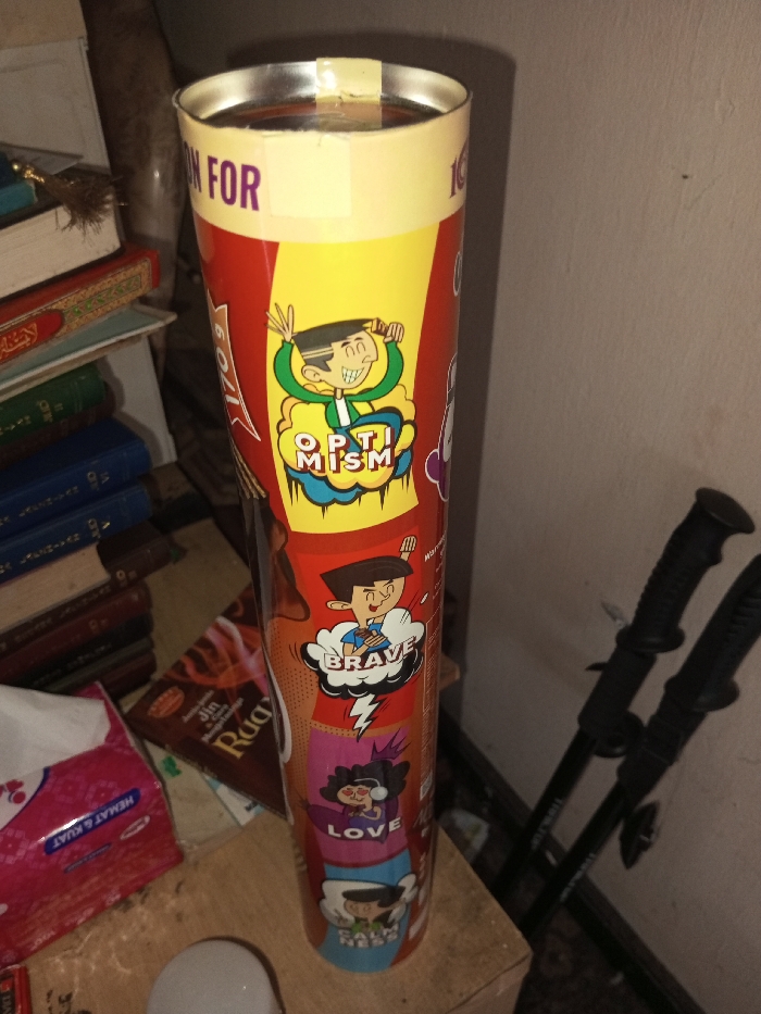 A tall, cylindrical container stands upright. It features cartoon images with words like "Optimism," "Brave," "Love," and "Calmness" printed on it. It's red, yellow, and other colors. The container is positioned on a wooden surface next to a stack of books and a box of tissues. Behind the container, a pair of black hiking poles lean against a wall.