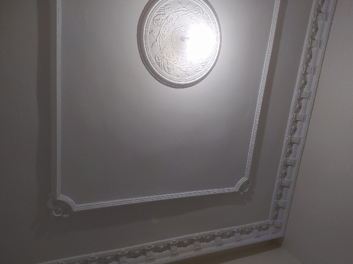 A low-angle shot captures a white ceiling with decorative elements