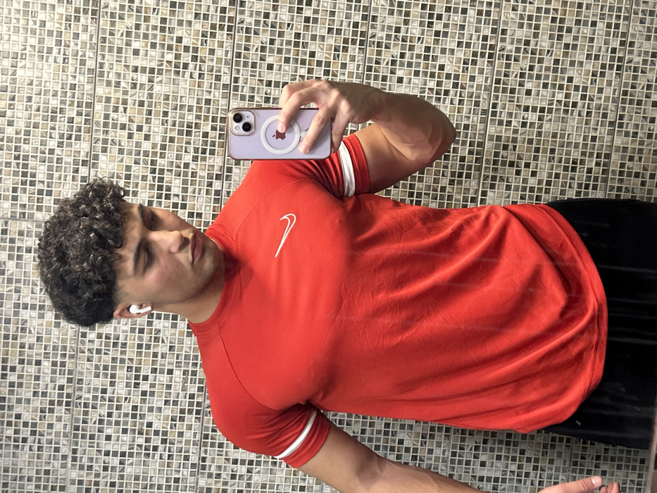 The scene is located in Joubar Municipality, Syria. The image displays a male individual indoors, capturing a mirror selfie. He possesses dark, curly hair with faded sides and a muscular physique. He is dressed in a red short-sleeved athletic shirt featuring a white Nike swoosh logo on the chest and two white stripes on each sleeve, paired with black athletic shorts. A white earbud is visible in his left ear. He holds a light purple smartphone, equipped with a white circular MagSafe accessory, in his right hand, positioned to reflect his image. His gaze is directed downwards and to the right. The background consists of a wall covered in small, square mosaic tiles in varied shades of grey, beige, and white.