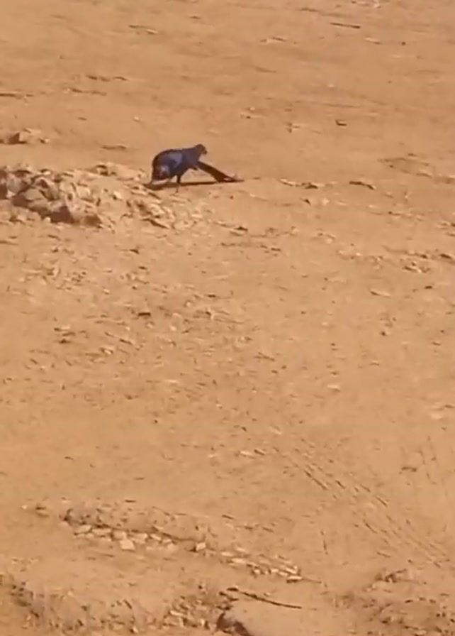 dark bird, possibly a crow, in a dirt area. The bird is walking around a pile of dirt and the surrounding area, which looks like a path or road. The background shows some green vegetation. The overall environment seems to be outdoors, possibly a rural or undeveloped area.