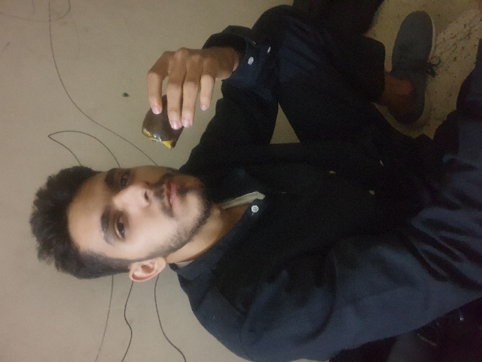A young man with short, dark hair and a beard holds a partially eaten chocolate bar. He wears a dark blue shirt and dark trousers. One foot, clad in a gray sneaker, rests on the floor. Lines sketched on the wall behind him form an abstract design.