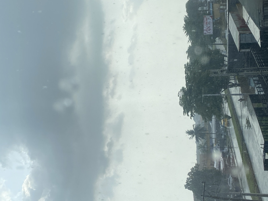 The image depicts an urban street scene in Egan, Nigeria, under heavily overcast and rainy conditions. The view is from an elevated perspective, looking down onto a multi-lane road that appears wet, indicating ongoing or recent rainfall; visible water droplets or streaks are present on the viewing surface. In the foreground, utility poles with numerous wires are prominent on both the left and right sides. On the lower right, partially obscured, are structures with corrugated metal roofs, possibly industrial containers or parts of a lower building. The mid-ground features a wet, paved road with a central green median strip. A single yellow vehicle, resembling a bus or large van, is visible on the left side of the road, moving away from the viewer. Further right on the road or median, a solitary individual is walking from left to right. The background consists of various green trees, including at least one tall palm tree, interspersed with indistinct urban buildings. A billboard displaying an advertisement is visible on the right side above the structures. The sky overhead is completely covered by dense, grey clouds.