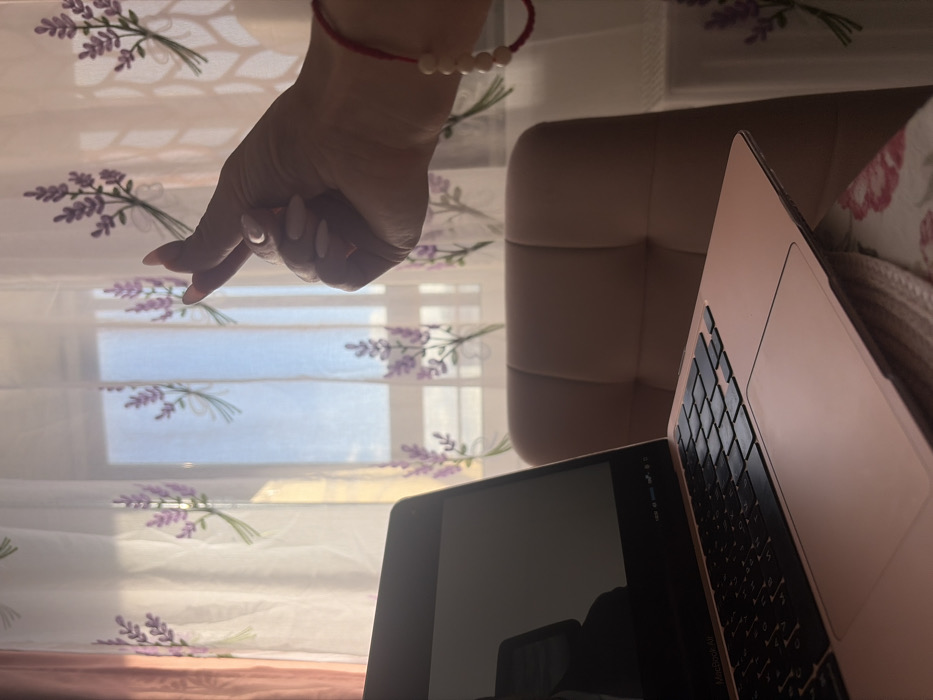 An indoor scene is depicted, illuminated by natural light from a window in the background. No specific visual identifiers are present to confirm the location within Novosaratovka, Russia. In the foreground and center-left, a rose gold Apple MacBook Air laptop is open, resting on a light-colored surface with a pink floral pattern, possibly a blanket or tablecloth. The laptop screen is dark and reflective, and its black keyboard and trackpad are visible. To the right and slightly above the laptop, a human hand, appearing to be an adult's, is visible. The hand has light-colored nail polish and is performing a "finger heart" gesture, where the thumb and index finger are crossed. A red string bracelet with four small, light-colored, round beads is worn on the wrist. In the midground, behind the laptop, a light brown or beige upholstered chair with a segmented backrest is partially visible. The background features a window covered by sheer white curtains adorned with repeating purple lavender bouquet patterns and green stems. Beyond the curtains, a clear blue sky is visible, indicating an exterior view.