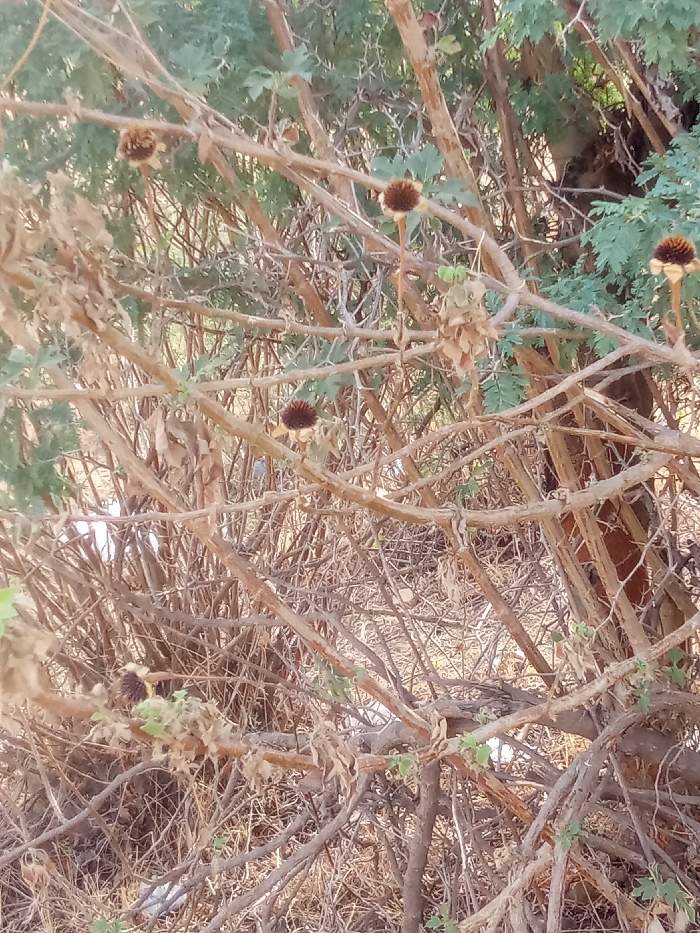 Dry, tangled branches dominate the scene, dotted with brown, spent flower heads