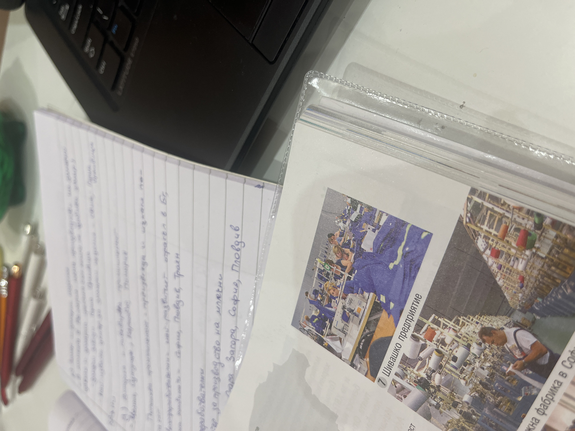 cluttered workspace with a laptop, handwritten notes, pens, and a document in a protective sleeve. The document appears to be a textbook or informational sheet featuring images of people working in a sewing or textile factory. The text on the document includes "Шивашко предприятие" (Sewing Enterprise) and mentions a "Sewing factory in Sofia." The handwritten notes also mention Sofia, Plovdiv, and Stara Zagora, all cities in Bulgaria. Pernik is not mentioned or suggested in the image.