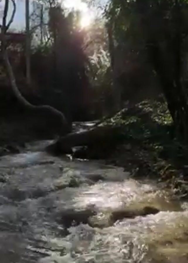 The video depicts a small, fast-flowing stream in a wooded area