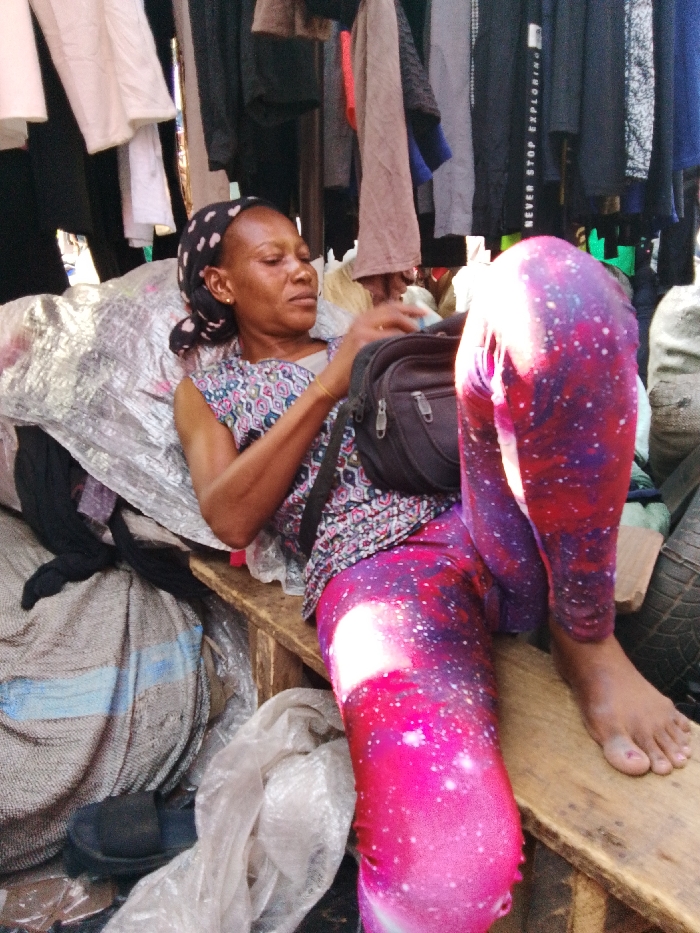 An adult female is resting in what appears to be an outdoor market stall, consistent with commercial areas in Lagos, Nigeria