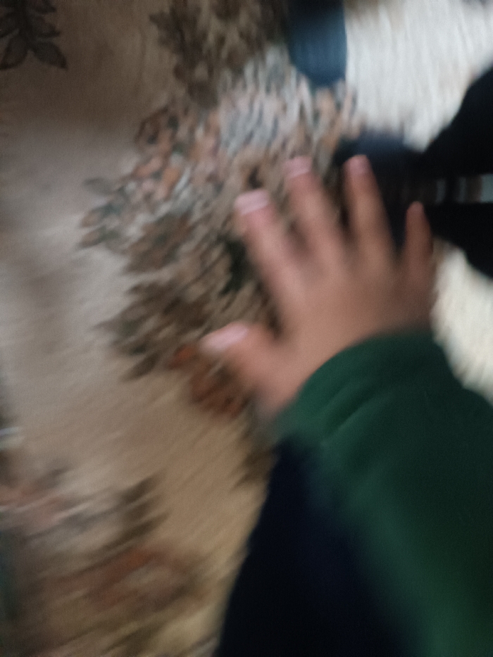 - "The image displays a high-angle, heavily motion-blurred view of a human hand and arm positioned over a patterned rug, situated indoors in Andijan City, Uzbekistan" by FM-514pQ2, licensed under CC BY 4.0