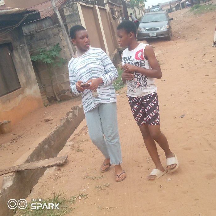 Two individuals are captured outdoors, engaged in conversation. The person on the left is wearing a striped long-sleeved shirt and light-colored jeans. The person on the right has on a tank top and patterned shorts. Both are wearing sandals. They stand on a dirt path alongside a drainage ditch, with a wooden plank laid across it. A silver car is visible in the background. The sky is overcast. The setting appears to be a residential area with various structures visible in the periphery.