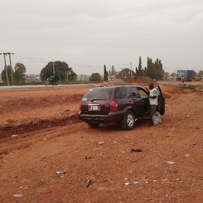 The image depicts an outdoor scene in Kakau, Nigeria, characterized by reddish-brown unpaved earth under an overcast sky. A dark red Acura MDX SUV, bearing a "LAGOS D108..." license plate and featuring chrome wheels, is parked on the bare ground. The driver's side front door of the SUV is open. A male individual stands next to the open door, wearing a light-colored shirt and dark trousers, with his right arm extended into the vehicle's interior. A translucent plastic bag containing contents is positioned on the ground near his left foot. The foreground and mid-ground consist of uneven, unpaved earth with tire tracks and an earthen trench. Scattered litter, including plastic bottles and wrappers, is visible on the ground. In the background, a paved road is discernible, on which a motorcycle carrying two individuals travels from left to right. Utility poles and overhead lines are present on the left. Further in the background, trees, distant structures, and a blue container truck labeled "Solomon Logistics" are visible on the right, accompanied by two distant figures.