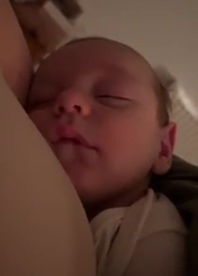 A close-up video shows a baby sleeping peacefully while resting on a person's chest