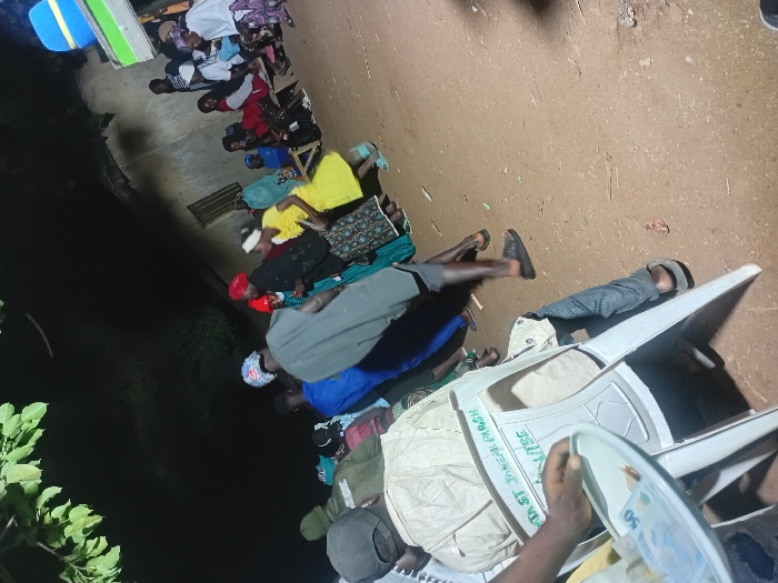 People are seated on chairs and ground, possibly for an outdoor event. Some are in casual clothing, others in dresses or formal attire. The setting appears to be a yard, with a building nearby. A person holds a tray of money, possibly collecting donations. The lighting is poor, suggesting it is nighttime. There is a chair labeled "D. ST. JOSEPH PARISH, VISEE" in the foreground.