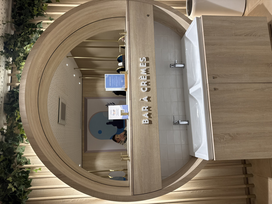 An interior view depicts a circular "Bar à Crèmes" counter within a commercial establishment in Marcq-en-Barœul, France. The central feature is a large, light wood-toned circular unit. The upper half of this unit contains a mirror reflecting the interior space. In the mirror's reflection, a person is visible, holding a light-colored smartphone and seemingly capturing the image. Behind the reflected person, a large, framed artwork with abstract blue and white shapes is visible on a light wood-paneled wall. Also reflected on the counter are two display stands: one featuring a "Google" review QR code and another with text, likely indicating "Lotion hydratante." Several small, gold-colored cylindrical dispensers or decorative elements are present on the reflected counter surface. Above the mirror's reflection, recessed ceiling lights and a vent are visible, along with a patterned ceiling. On the actual counter unit, below the mirror, the words "BAR À CRÈMES" are spelled out in raised white letters against a light wood panel. Below this, a section of white subway tiles forms a backsplash for a white dual-basin sink unit equipped with two chrome faucets. The lower section of the counter unit consists of two light wood-toned cabinet doors with small, dark handles. Faux green ivy foliage is draped along the top edge of the circular unit and extends onto the adjacent light wood-slatted wall. The floor is light-colored tile. To the right of the counter, a tall, white cylindrical waste receptacle is partially visible.