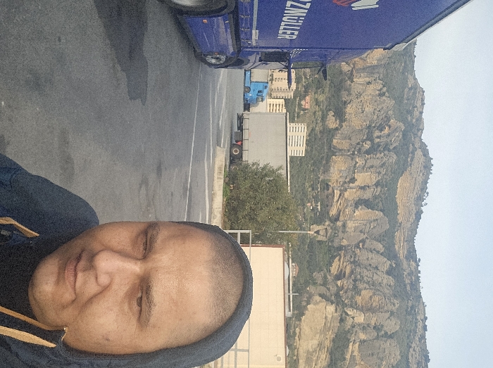 The image captures a selfie of a male individual in a truck parking area located in Ventimiglia, Italy, with a mountainous backdrop