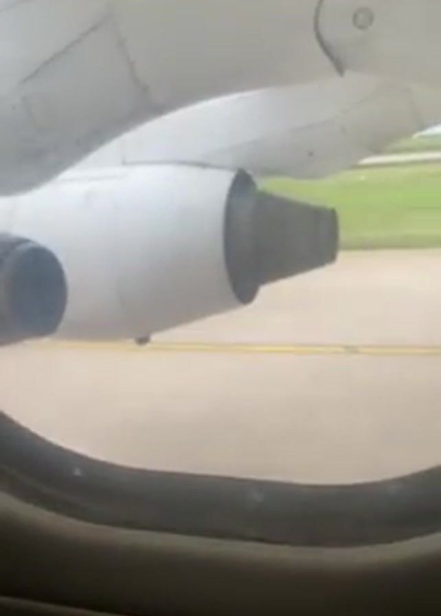 view of an airplane engine through a window, while the plane is on the tarmac. The engine is white and the window is round. The tarmac is concrete with yellow lines. There is green grass visible in the background. There is indistinct speech in the background.