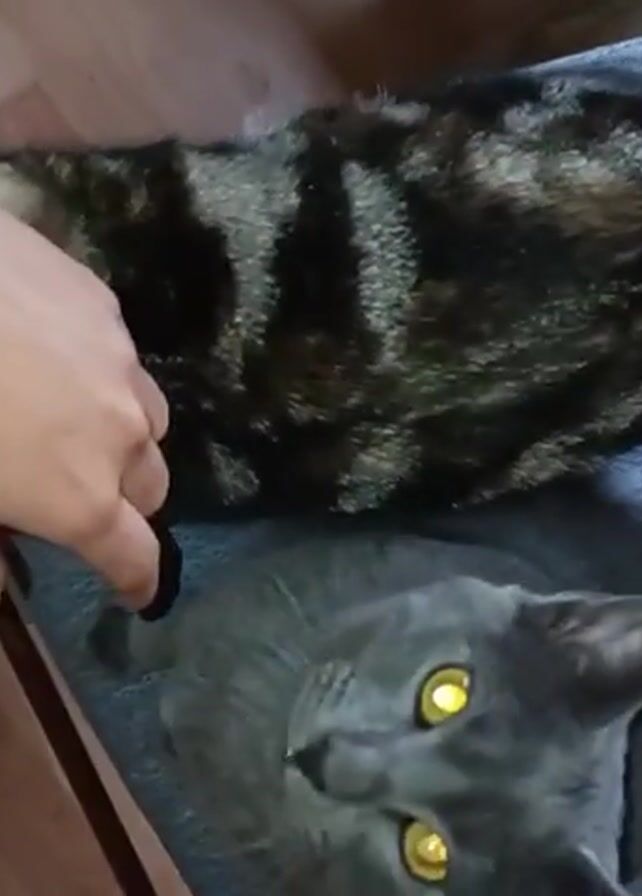 A high-angle shot depicts two cats relaxing on a blue chair. A tabby cat lies on top, while a gray cat with striking yellow eyes is situated beneath. A hand wearing a white and brown polka-dotted sleeve gently pets the gray cat's neck. The cats are indoors on a chair with a wooden frame, resting on a light-colored wooden floor.