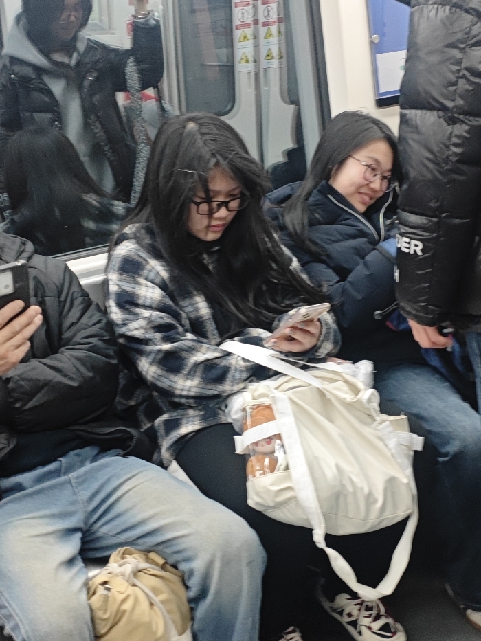 An indoor scene within a modern subway car, likely in Shapingba District, China, depicts multiple individuals during transit. In the foreground, a young East Asian female with long dark hair and black-rimmed glasses is seated, actively viewing a light-colored smartphone held in both hands. She wears a blue and white plaid long-sleeved shirt and dark pants. A cream-colored tote bag with a clear front pocket containing a small, light-brown plush toy hangs from her shoulder, resting on her lap. To her immediate right, another young East Asian female with long dark hair and round-rimmed glasses is seated, wearing a dark blue puffer jacket. She smiles subtly, looking towards the right side of the frame. To the left of the central figure, a partial view of a male individual is visible. He wears a dark puffer jacket and light-wash blue jeans, holding a dark-colored smartphone in his right hand. A light-colored drawstring bag rests on his lap. In the background, visible through a reflective surface or window, another individual in a dark puffer jacket and grey hoodie stands, holding onto a vertical silver pole or strap. White subway interior walls, a door frame, and partially visible red warning symbols are discernible. The overall lighting is consistent with interior artificial light.