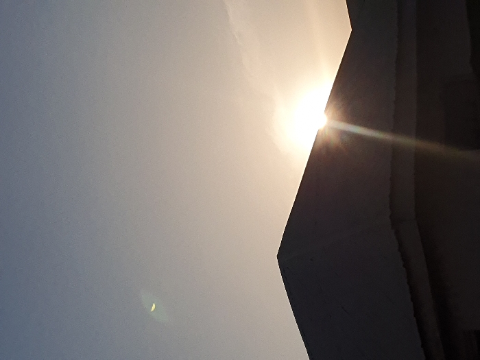 The image depicts a sunset or sunrise view over a building, seen from a slightly elevated or distant perspective. The sky exhibits a gradient, transitioning from a light blue-grey at the top to a warm, yellowish-orange near the horizon. A bright, partially obscured sun is visible behind the upper edge of a dark, silhouetted building structure, emitting prominent sunbeams and a visible lens flare in the upper left quadrant of the sky. The building's roofline, occupying the lower third of the frame, is dark grey or black, rendered in silhouette, and features angular, possibly flat or low-pitched surfaces with a distinct corner prominent in the center-left. No people, discernible actions, or specific identifying landmarks are present to confirm the location as Lokoja, Nigeria.