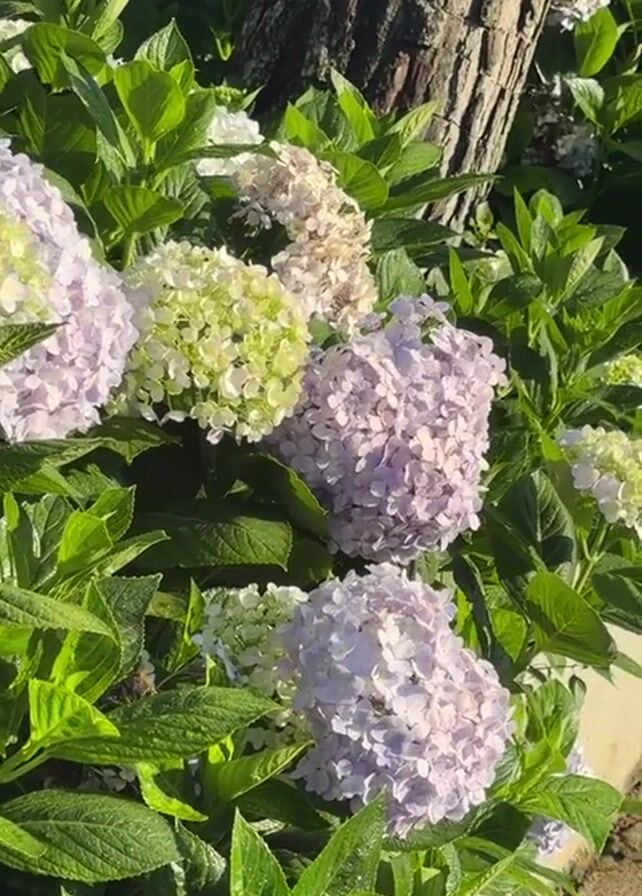 garden bed filled with hydrangeas of various colors including pale lavender, green, and white, growing alongside a tree