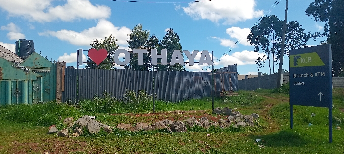 sign in Othaya, Kenya, located at the coordinates -0.562, 36.941. The sign reads "I LOVE OTHAYA" with a large red heart in the middle. The sign is made of white letters on a white background and is mounted on a metal pole in front of a corrugated metal fence. The fence is partially obscured by green grass and small trees. There is also a KCB bank sign pointing towards a branch and ATM. The sign is located on the side of a dirt road and is surrounded by green grass and some rocks. The background shows a blue sky with white clouds, and some trees are in the background on the right side of the image.