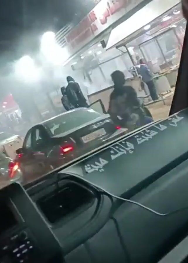 The video, taken from inside a car at night, shows a street scene with moderate to heavy smoke or fog obscuring visibility. Several cars are visible, including a silver Volkswagen, a dark-colored car with its trunk open, and other vehicles further down the street. Some people are walking on the street. There's a building with bright lights and a partially visible sign in the background, possibly a food establishment, where individuals appear to be working behind a counter. The car's dashboard is visible, featuring a sticker or decal with Arabic script. An individual can be seen holding a phone or device, potentially recording the scene. The overall atmosphere suggests a chaotic or disturbed environment due to the smoke and activity.