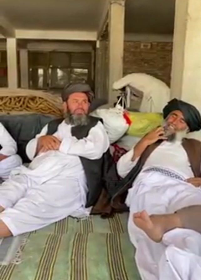 Three bearded men are sitting in a relaxed manner on a striped rug in what appears to be a simple, unfinished building. They are wearing traditional clothing that includes vests over white garments, and headwear that could be turbans or caps. One man is barefoot. They appear to be in conversation, with one man actively speaking. The building’s structure is visible with concrete pillars and beams. In the background, there are miscellaneous objects like rolled materials and a white covered item. The scene has a casual, laid-back atmosphere.