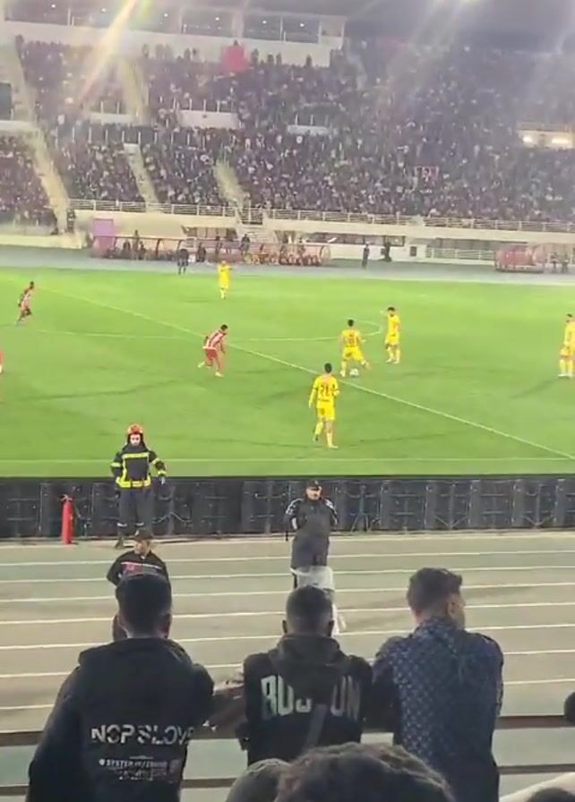 soccer game being played in a stadium. Several players wearing yellow uniforms and others wearing red and white are on the field, kicking a soccer ball. Behind the players are a few people standing, including one in a red fireman's uniform. Behind them is a short white wall. Beyond that are stadium seats, filled with people. The stadium has large stadium lights illuminating the field. The video is taken from behind a group of people leaning on the white wall.