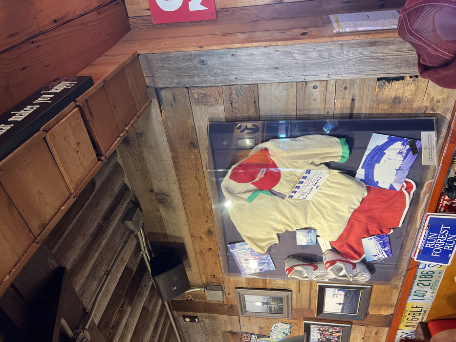 The image depicts the interior of a Bubba Gump Shrimp Co. restaurant, specifically identifiable as the location on the Santa Monica Pier in Santa Monica, United States, due to a framed photograph of the pier's Ferris wheel visible on the left wall. The environment features walls and ceilings constructed from various distressed wooden planks. A central, large glass-fronted display case is mounted on the wooden wall. Inside, a complete replica of Forrest Gump's running costume is arranged: a cream-colored, short-sleeved top with green trim, red athletic shorts with white trim, a red baseball cap, and a pair of white and red Nike Cortez-style sneakers. Surrounding the costume within the case are several photographic prints, including the aforementioned Santa Monica Pier image, a sign for "MARCHING ORDER SPORT FISHING & RENTALS GULF SHORES, ALABAMA," and a film clapboard prop with text indicating "FORREST GUMP." Below the display case, a blue novelty license plate clearly reads "GREENSBORO ALABAMA RUN FORREST RUN." Other partial license plates from various states, including California, Michigan, and Hawaii, are also visible. To the left of the main display, additional framed photographs are hung on the wooden wall. A black speaker with exposed conduit is mounted on the upper left wall. Above the display, a black sign with white text partially reads "...hat makes you happy." On the far right, a red sign with a large white "S" is partially visible. A portion of a red booth seat and a black water bottle are visible in the lower foreground, indicating a dining area. No individuals are clearly identifiable.