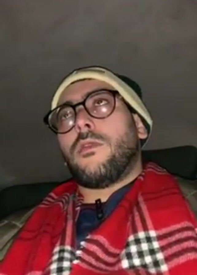 A man is shown in a car. He has a beard and wears glasses, a beanie, and a red and white plaid scarf. The car interior is dark. The man looks up with a neutral expression as music plays.