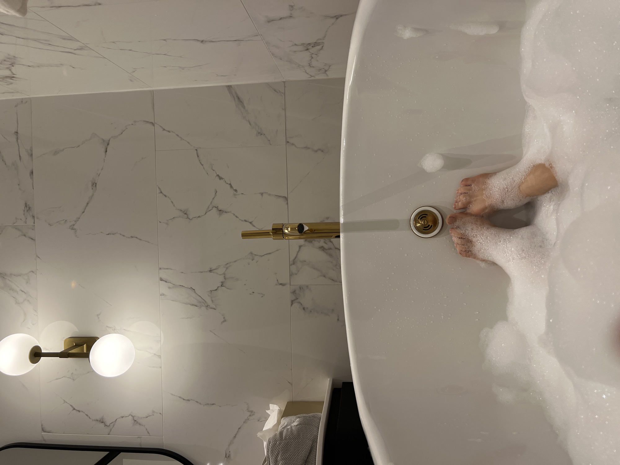 A person's legs and feet are visible in a bathtub filled with soapy water. The bathtub is white and positioned in a bathroom with marble tile walls. A gold-colored faucet and drain stopper are visible on the side of the tub. On the wall, there is a gold-colored light fixture with two round, white shades. The scene suggests a relaxing bath setting, possibly in Spa, Belgium, if that is the city of the bathtub, based on the user's request.