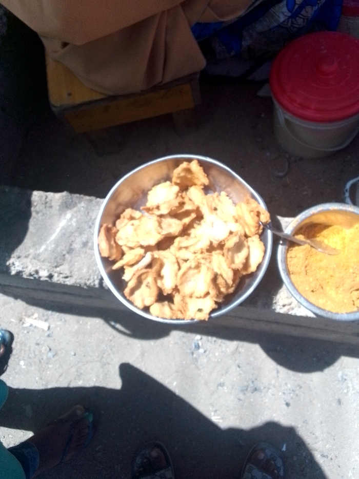 Two metal bowls rest on a concrete ledge. One bowl contains fried plantain chips, the other holds yellow powder with a spoon resting inside. Behind the bowls, a yellow stool and a red-lidded bucket are visible. A person's feet, wearing sandals, are seen in the foreground, casting a shadow.