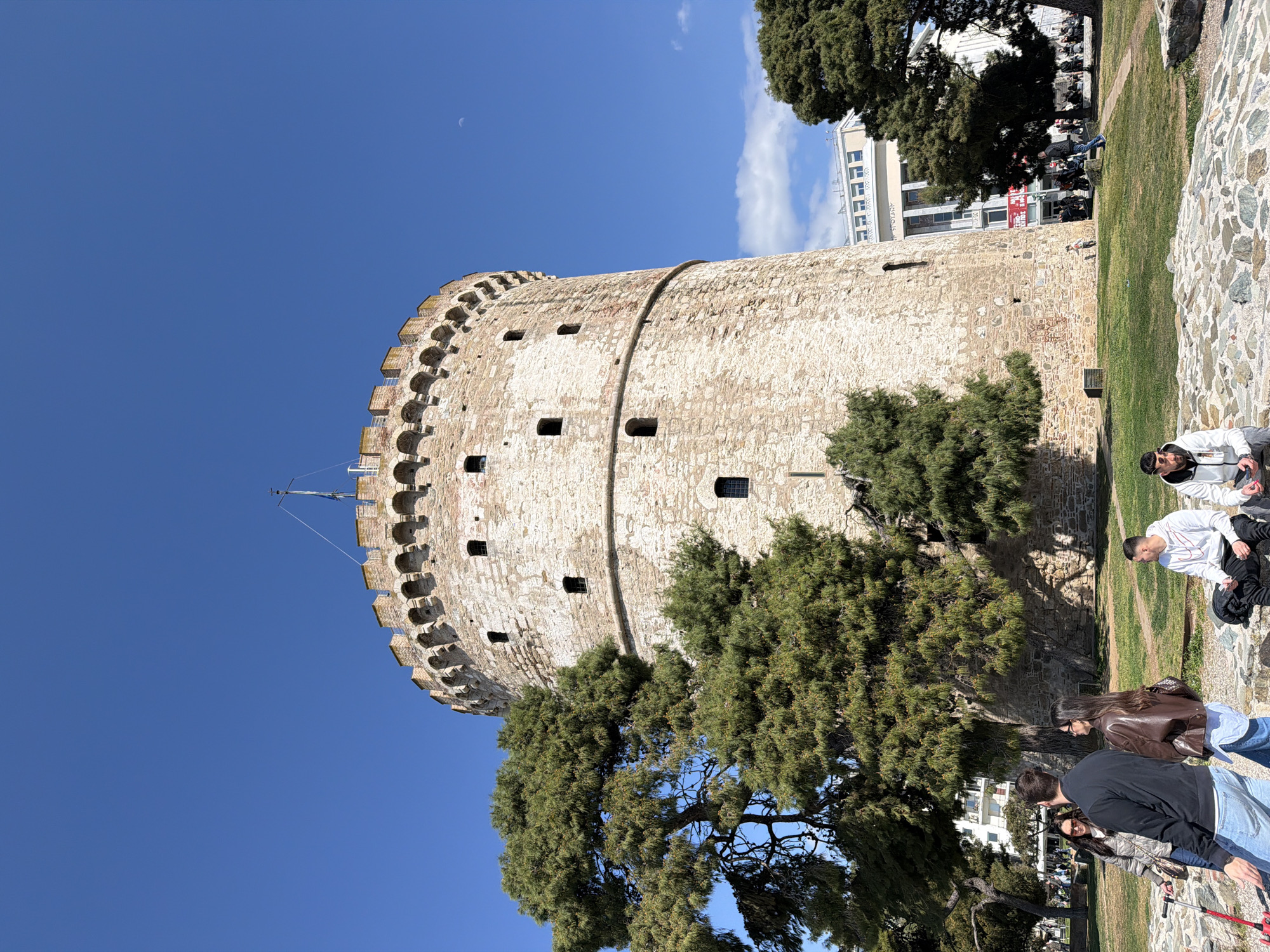 The image depicts the White Tower of Thessaloniki, located within the Thessaloniki Municipal Unit, Greece, under a clear blue sky with a visible crescent moon in the upper right quadrant. The tower is a cylindrical, light-colored stone structure featuring a crenellated top with arched openings and multiple small, dark rectangular windows. A flagpole with a dark blue flag is mounted at the apex of the tower. In the foreground, a grassy area with scattered large green trees occupies the lower third of the frame. On the left, a male in a dark jacket and blue jeans stands next to a female in a brown leather jacket and blue shirt. Another female in a light-colored jacket is partially visible behind them. A red kick scooter is visible on the ground near these individuals. On the right, two males are seated on a low stone retaining wall. One male wears a white hoodie with a black Nike swoosh logo, dark pants, and a dark beanie. Further back, additional people are visible walking and congregating on the grass and near distant buildings. Behind the tower and trees, multi-story urban buildings are visible, one featuring a prominent red sign with Greek text. The scene is illuminated by daylight, suggesting a sunny day.