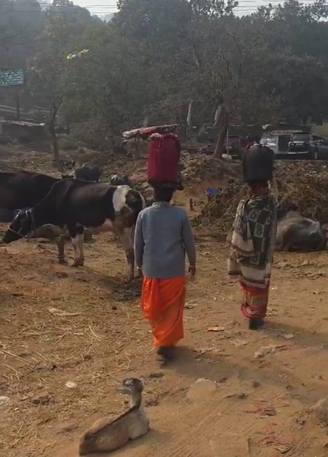 The video depicts an outdoor scene in a rural or semi-rural area. Two women are walking away from the camera, each carrying a container on their head. They are walking across a dirt ground with scattered straw and debris. Several cows, some black and white, are standing or lying down in the area. A small deer-like animal is lying on the ground near the bottom of the frame. In the background, there are trees, simple buildings, and a few vehicles parked further away. Several people are gathered near a large green container interacting with the cows. The overall setting suggests a village or rural environment with livestock and people going about their daily activities.