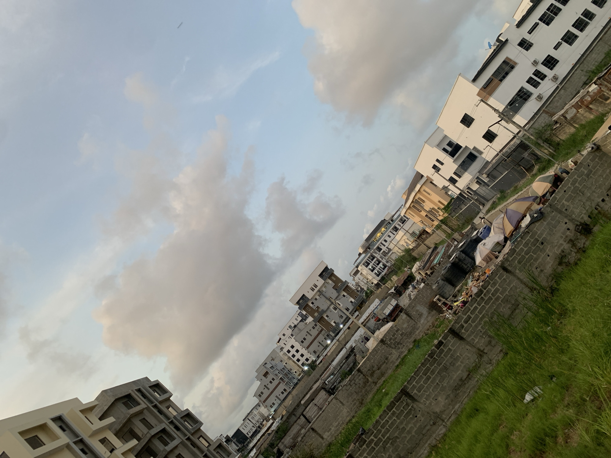 The image depicts an expansive view of a developed area within the city of Moba, Nigeria, captured at an oblique angle. The sky occupies the upper half, featuring a light blue hue with numerous scattered, irregular clouds ranging from white to light grey. In the foreground, originating from the top-left, a multi-story building, likely residential, is visible. It exhibits a contemporary architectural style with light beige or cream-colored upper sections and grey concrete finishes on its lower, multi-windowed facade, suggesting ongoing construction or a recent build. The midground and background are densely populated with a mix of multi-story buildings, predominantly residential structures with modern designs. These buildings vary in color, featuring white, beige, and grey exteriors, numerous windows, and some visible air conditioning units. Utility poles are interspersed among these structures. At ground level, running across the lower portion of the image, is an area characterized by concrete cinder block walls of varying heights and states of completeness, bordering patches of unkempt green grass and tall reeds on the far left. Immediately behind these walls, and extending into the mid-right, an informal settlement or market area is observed. This area contains a significant accumulation of objects, including corrugated metal sheets, lumber, various debris, and what appear to be multiple makeshift stalls or shelters covered by striped awnings (e.g., blue and white, brown and white), suggesting commercial or residential activity. Specific human figures or actions are indistinct due to the distance and image resolution, but the presence of these structures implies human occupation and interaction. The ground appears unpaved in this lower section.