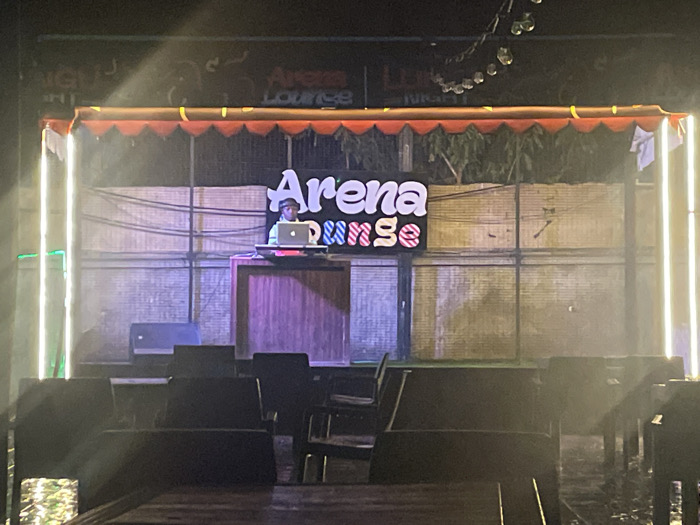 The image depicts an outdoor or semi-outdoor lounge area at night, located in the city of Unknown, Unknown. The central focus is a stage or performance area featuring a prominent neon sign that reads "Arena Lounge" in white and pink lettering. Below the sign, a male individual with a dark cap and light shirt operates a silver laptop on a dark wooden DJ booth. Vertical LED light strips, emitting white and green light, frame the stage on both sides. Behind the sign and DJ booth, a wall constructed from bamboo or reed matting is visible. An awning with red and yellow stripes extends above the "Arena Lounge" sign. To the left of the DJ booth, a dark speaker or monitor rests on a lower platform. The foreground, viewed from behind, consists of several dark, unoccupied tables and chairs or sofas, indicating a seating area. Overhead, faint outlines of decorative lights or foliage are present. The scene is illuminated primarily by artificial light sources, casting a dark ambiance elsewhere.