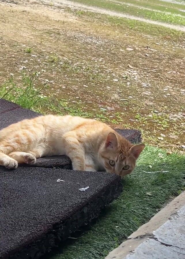 A stationary medium shot shows a light orange tabby cat lying on a black rubber mat, its head down near artificial green grass