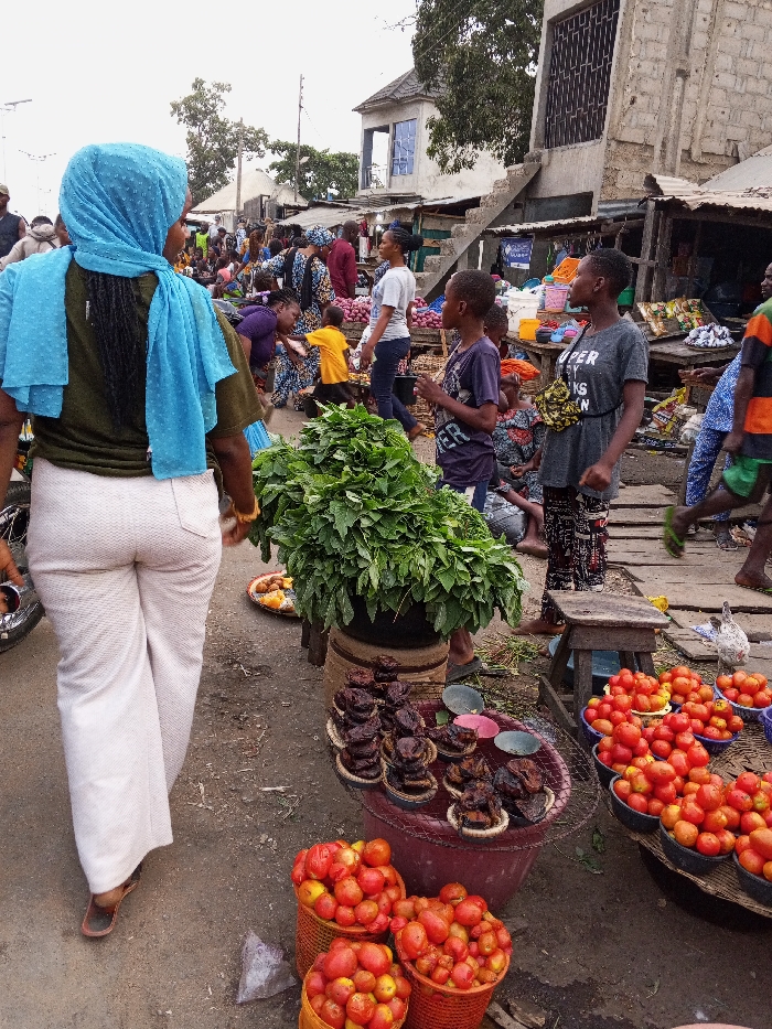 A bustling market scene unfolds with a woman in white pants and a blue headscarf walking away from the camera