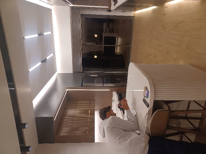 The image depicts the interior of a modern kitchen and living space located in Dahiyat Qudsaiya, Syria. A single male individual, dressed in a light gray hooded sweatshirt and dark trousers, is present. He is leaning forward, resting his forearms on a white marble-topped kitchen island with a fluted base. He holds a black digital camera with both hands, appearing to interact with its screen or controls. On the island's surface, a black remote control and a small multi-compartment tray containing several small, colored objects are visible. Two light-brown wooden bar stools with white upholstered seats are tucked under the island. The kitchen area features dark gray upper and lower cabinetry. A section to the left incorporates a wooden slatted back panel with integrated vertical LED strip lighting and a stainless steel refrigerator. A white countertop is visible adjacent to the refrigerator. To the right, additional dark gray lower cabinets with a white countertop and a stovetop are present, also illuminated by vertical LED strips. The flooring is light-colored wood or laminate. The ceiling features multiple track lights with cylindrical fixtures and extensive recessed LED strip lighting along edges and within a central rectangular recess. In the background, large, dark-framed sliding glass doors open to another room or balcony, reflecting internal lighting. Through the doors, indistinct furniture, possibly a white sofa, can be partially discerned.