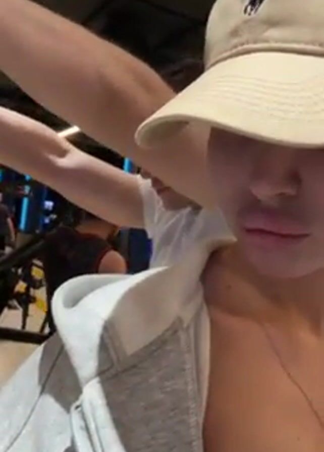 A person wearing a beige baseball cap with a Polo logo is shown from the chest up. The person has fair skin and a gold chain necklace. The person wears a tan tank top with a light grey zip up hoodie over it. An unidentified individual off camera is standing behind them, adjusting the baseball cap. The person in frame is looking directly into the camera and opens their mouth as if surprised. The indoor environment is dimly lit. In the background, several other people can be seen.
