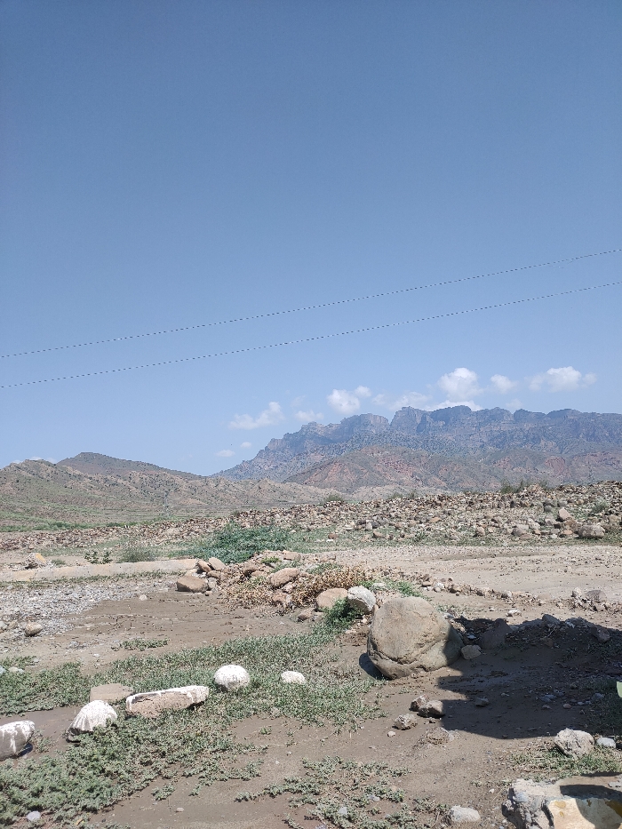 The image displays an arid, mountainous landscape consistent with terrain found in or near Dera Ismail Khan, Pakistan. The upper third of the frame is dominated by a clear, light blue sky, traversed by two faint, dark, horizontal lines resembling power or communication wires. In the background, a rugged mountain range features dark, rocky peaks and slopes, with visible geological strata and areas of reddish-brown coloration. Scattered white cumulus clouds are present above the mountain ridge. The midground consists of a dry, rocky expanse with sparse, low green vegetation and light brown soil. The foreground features a predominantly light brown, gravelly ground with scattered patches of low-growing green herbaceous plants. Numerous rocks of varying sizes and shapes are distributed across the foreground; notably, a large, rounded, light brown rock casts a shadow towards the lower right. Several smaller, lighter-colored rocks are partially embedded in the soil on the left side. No individuals, active subjects, or prominent artificial structures are visible within the scene.