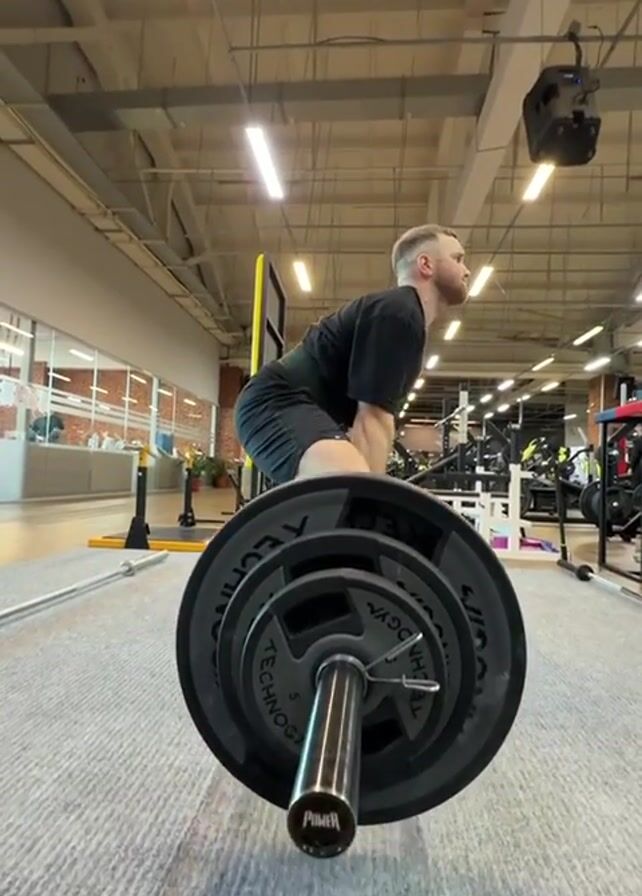 A man is performing a deadlift with a barbell loaded with weights in a gym. He is wearing a black shirt and black shorts, and appears to have a weightlifting belt on. The gym has gray carpet, various weight machines, and large windows in the background. The camera angle is low, focusing on the barbell and the man's lower body. The man lifts the weight, pauses briefly, and lowers it back to the ground.