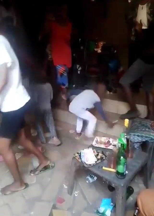 group of people, including several children, gathered in what appears to be an outdoor or semi-outdoor setting. The ground is tiled. The children are dancing or moving around. There is a small plastic table with items on it, including what appear to be bottles, food on a plate, and cash. Some adults are watching. The scene seems to be a casual social gathering.