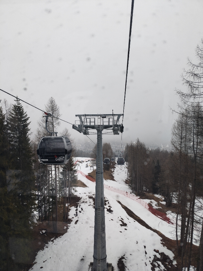 The image presents an aerial perspective from within a gondola cabin, looking down a ski slope towards the valley of Cortina d'Ampezzo, Italy, under overcast conditions