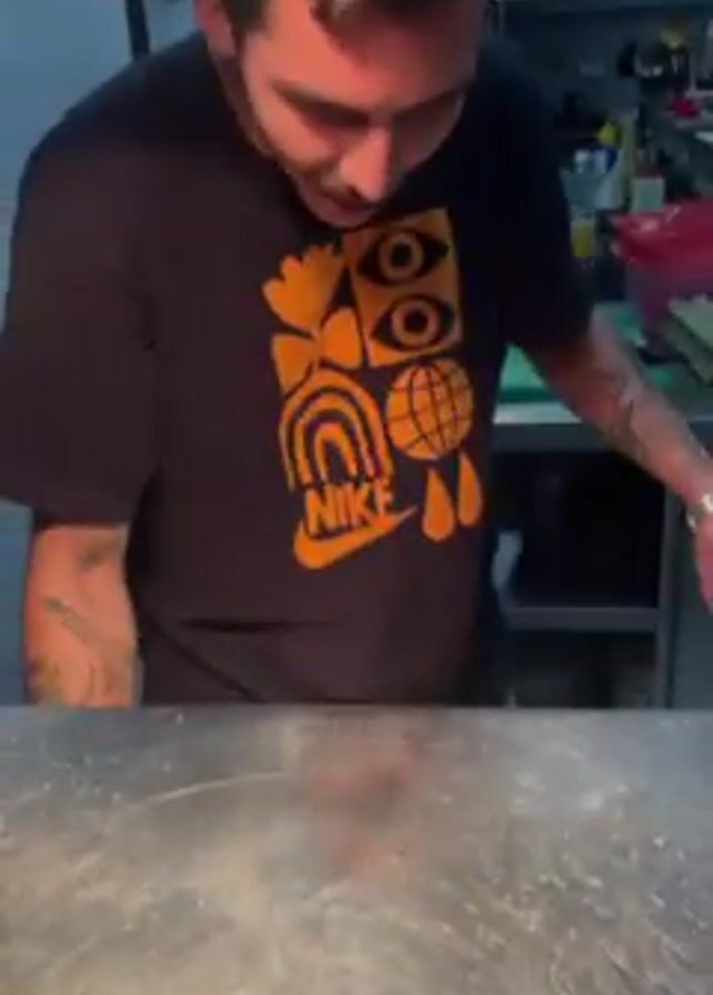 - "A man with dark hair, a mustache, and tattoos on his forearms stands behind a metallic counter" by FM-OHvEx2, licensed under CC BY 4.0
