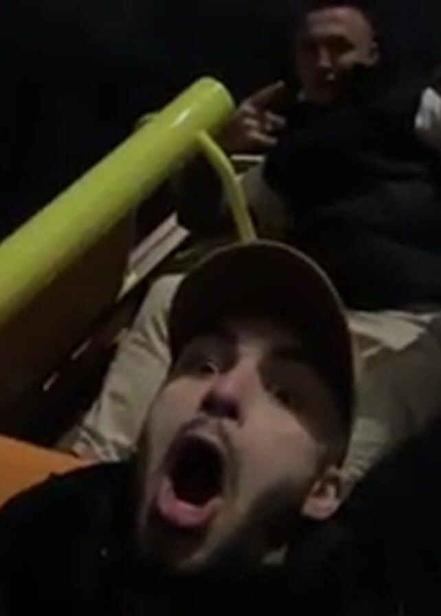Two young men are on playground equipment at night. The man in the foreground is wearing a tan baseball cap and a dark jacket. He has a beard and is looking at the camera with his mouth open in a yell. Behind him, another man wearing a black vest and light colored pants is standing on a yellow bar and making hand gestures. A street light is visible in the distance. The background is dark.
