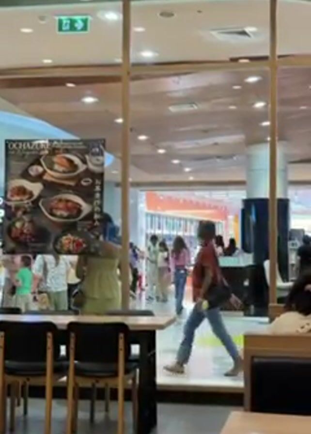 interior of a restaurant looking out onto a busy shopping mall. The restaurant has wooden tables and chairs. A poster is visible on the left of the frame advertising a Japanese restaurant called "Ochazuke." Through the glass window, people are walking around the mall. Some are wearing masks. There is a large pillar in the mall and various shops in the background. The overall environment appears to be well-lit and populated.