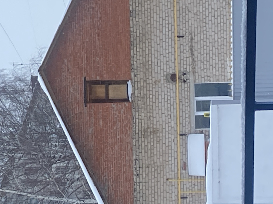 The image displays a two-story building section in a winter setting. The upper portion consists of a red brick gable wall with a snow-covered roofline. Centered within this gable is a tall, narrow window with a dark frame, showing a warm, yellowish light from its interior. Snow lightly covers the sill of this window. The lower section of the building features a light-colored brick wall, separated from the red brick by a horizontal seam or crack. A yellow gas pipe runs horizontally across this lower wall, supported by dark brackets. Below the pipe and to the left, a white rectangular unit, partially covered in snow, is affixed to the wall. To its right, a multi-pane window with a white frame is visible, through which a yellow object is dimly seen. Further right on the light brick wall, a circular opening is present. The foreground contains a dark, snow-dusted railing or fence and a corrugated light-colored fence. The background reveals bare trees and an indistinct grey building beneath an overcast sky. No individuals are present. The specific location within Chaikovsky, Russia, cannot be determined from the visual information provided.