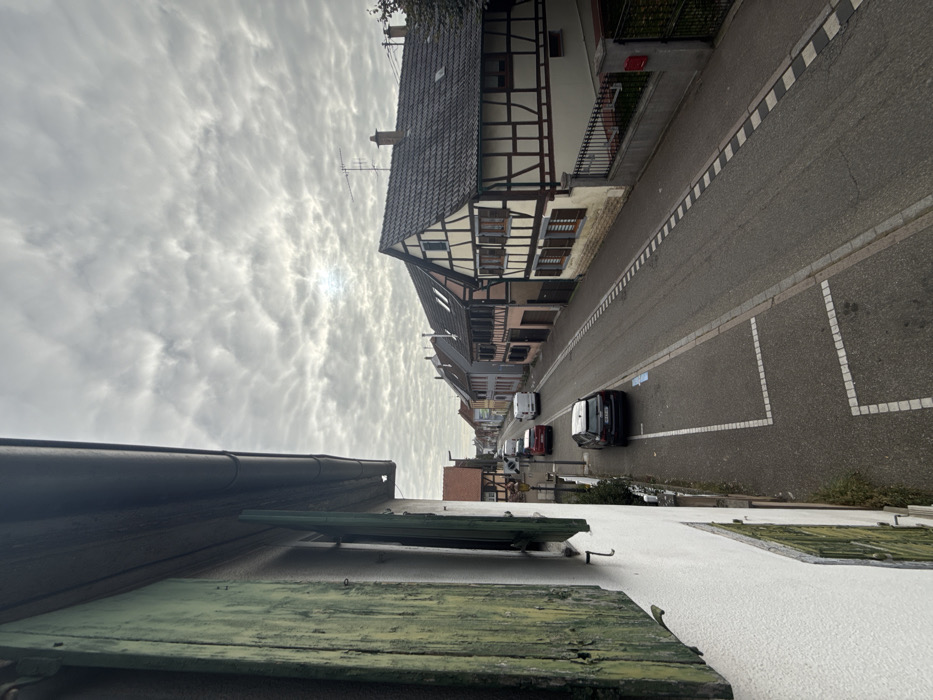 An elevated, downward-angled view captures a street scene in Brumath, France, under an overcast sky with visible sun filtration